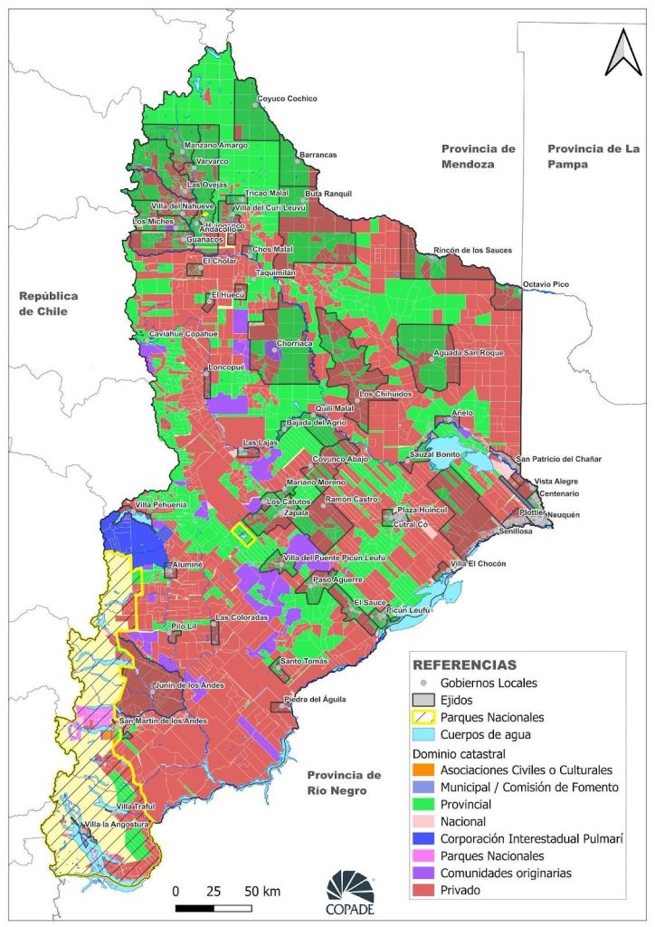 En cuanto a la situación del dominio territorial en la provincia del Neuquén, conforme a datos suministrados por la Dirección Provincial de Catastro para el año 2020, se observa que el 57,2% del territorio es de propiedad privada, mientras que el 35,9% corresponde al fisco provincial y el 4,2% a las comunidades mapuches. Por su parte la Corporación Interestadual tiene dominio sobre el 1,3% de la tierra restante y el resto se reparte entre el fisco nacional (0,6%), parques nacionales (0,4%)[1], el fisco municipal (0,3%) y asociaciones civiles o culturales (0,1%).